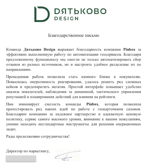 Команда Дятьково Design выражает благодарность компании Pinbox за